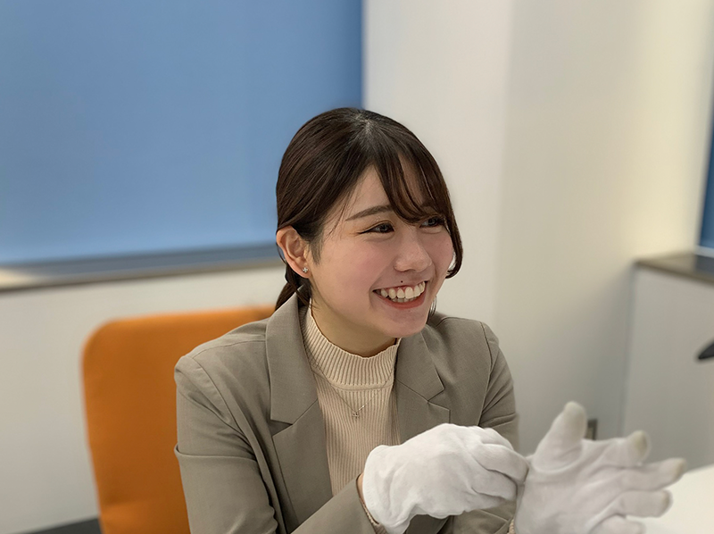 お客さまの思い出のこもった素敵な品物に触れれることに魅力を感じこの業種で就活をしていました。マックスガイでは無償引取した着物を障がい者施設に寄付するというCSR活動をしていて、とてもいい印象を受けました。入社を決めたのは、採用担当だった米澤さんと、最終面接をして下さった矢内さん、日奈子さんの人柄がとても温かかったからです。お三方とも褒め上手で、褒めて伸ばしてくれる会社だなと感じました。実際、入社するとホメホメ文化がありました。