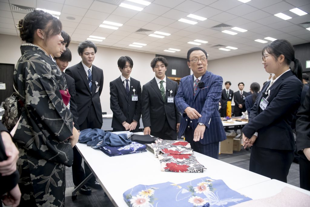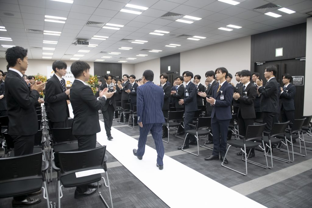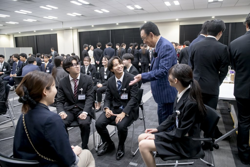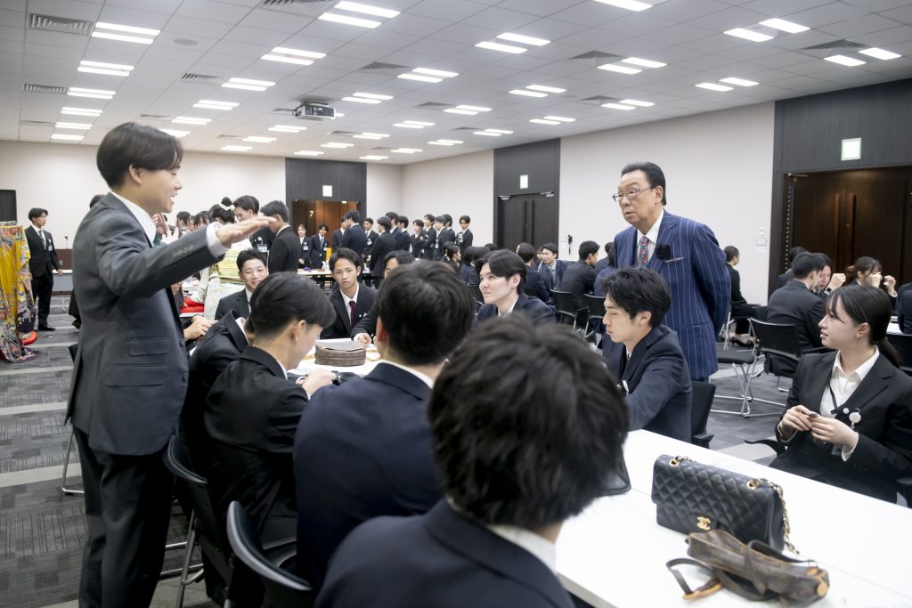 突然の登場に会場は大きな歓声に包まれ、内定者の皆さんも驚きと喜びの笑顔でいっぱいでした。
